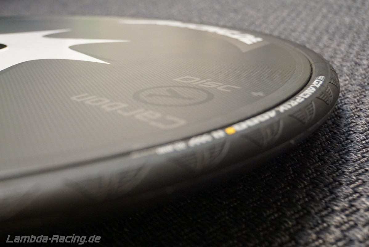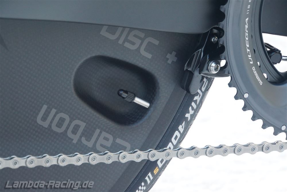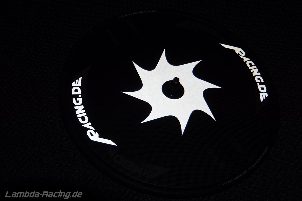 Wir montieren das Scheibenrad auch fahrfertig mit einem leichten CONTINENTAL Race Light Schlauch (75g) und einem CONTINENTAL Grand Prix 4000S II Reifen in 23mm für zusammen 50 Euro. Alternativ CONTINENTAL Force II Reifen mit 24mm Breite zum gleichen Preis. Auf Grund der fehlenden Schnellöffner der hinteren Bremsen an vielen Zeitfahrrädern empfehlen wir maximal den 23mm Reifen.