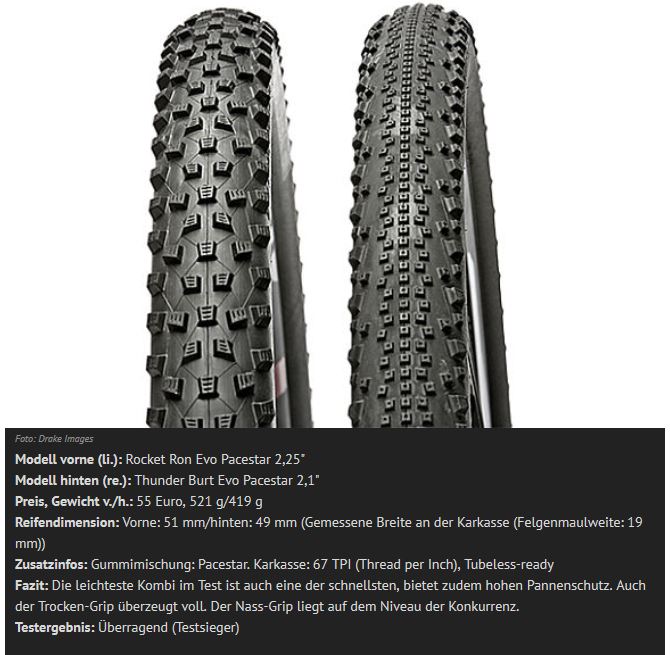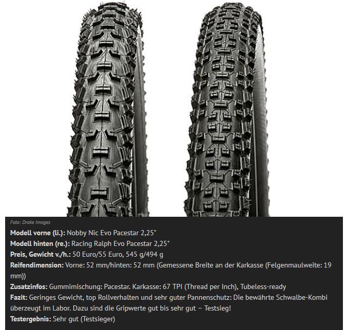 Für CC (Testsieger): SCHWALBE Rocket Ron Evo Pacestar (2,25" vorne) und Thunder Burt Evo Pacestar (2,1" hinten) (Bild) Für Marathon (Testsieger): SCHWALBE Nobby Nic Evo Pacestar (vorne) und Racing Ralph Evo Pacestar (hinten) (je 2,25") (Bild) oder eigene Wahl |